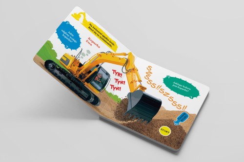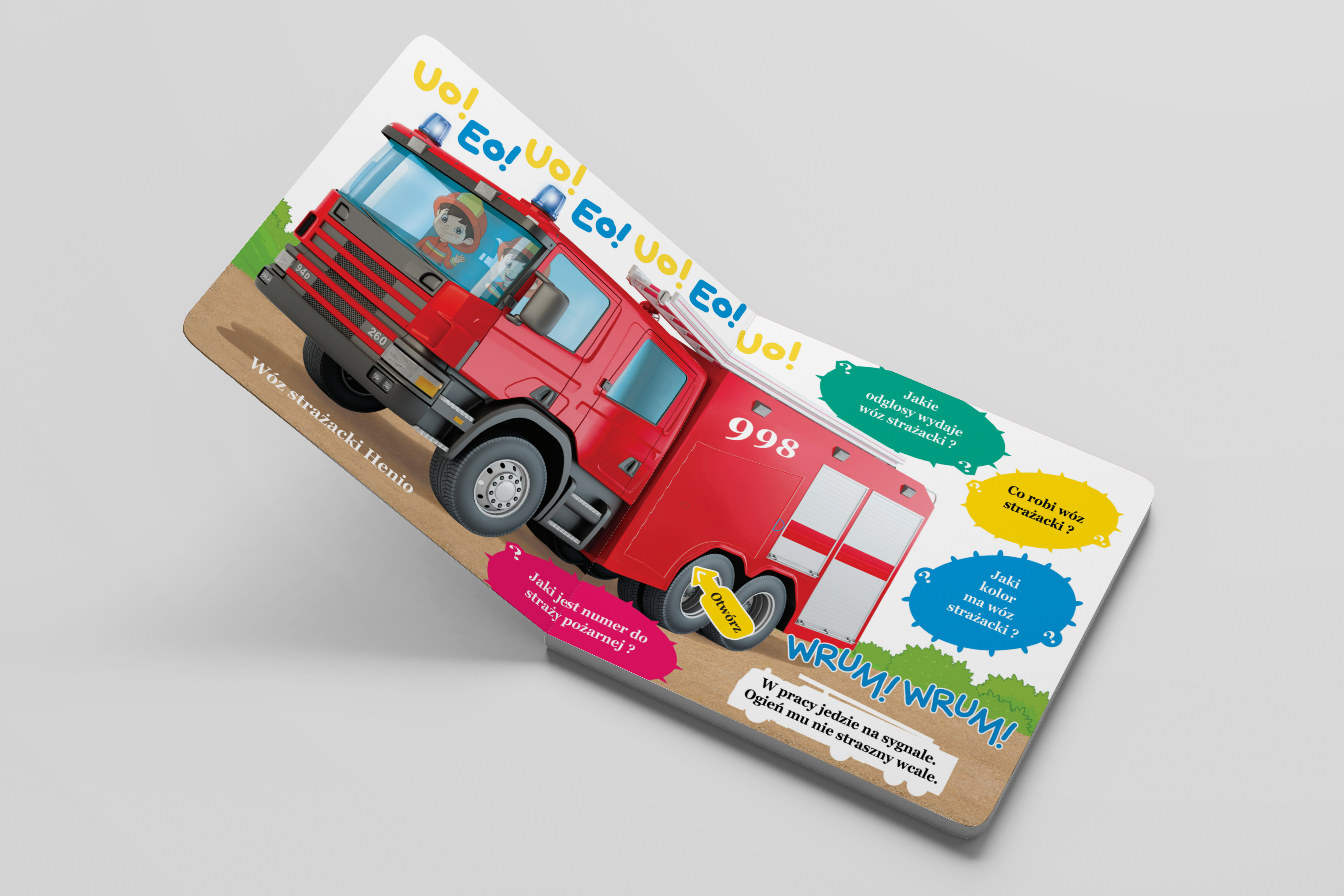 Odkrywając część pojazdu lub naciskając w odpowiednie miejsce na stronie, dziecko poznaje odgłosy wydawane przez pojazdy lub pracę,